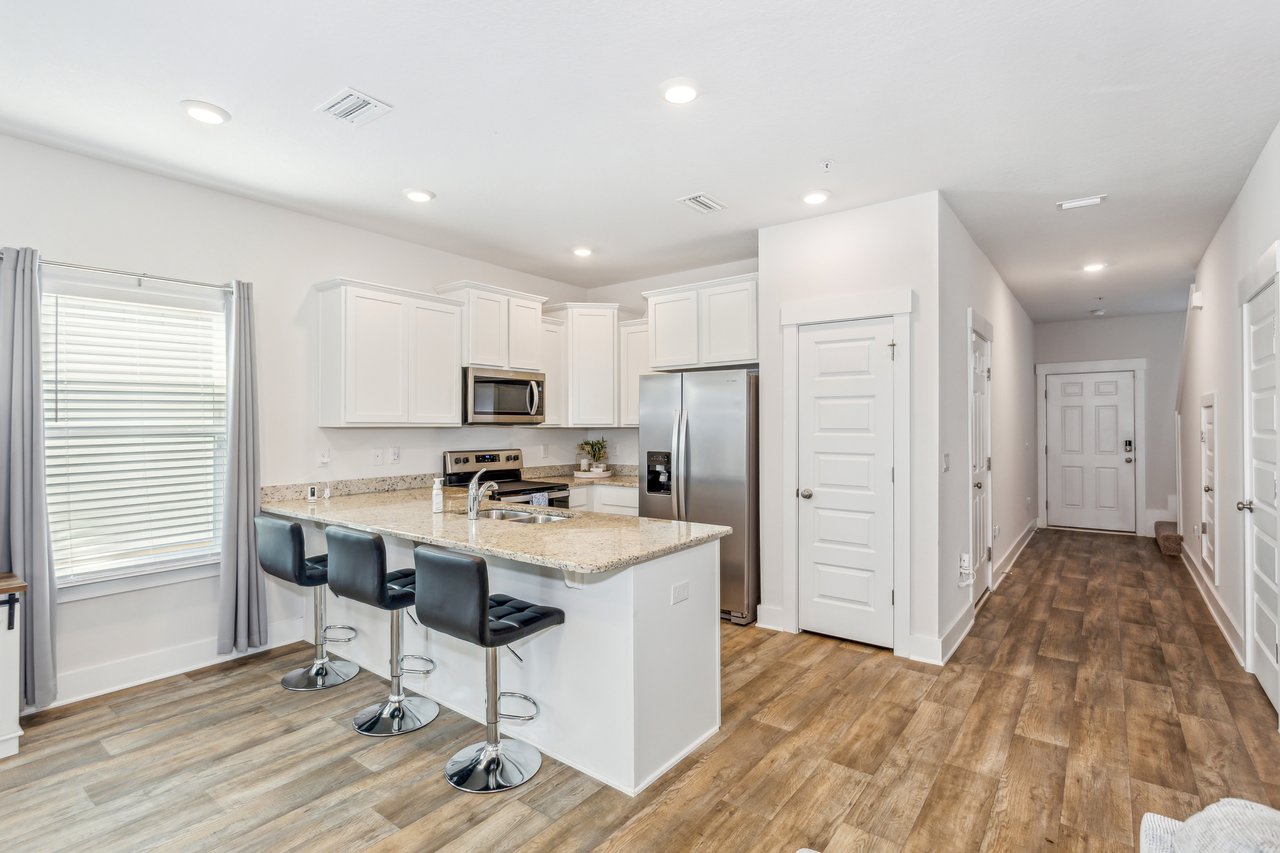 **OPEN HOUSE: SAT, 11/22, 10AM-1PM**Welcome to this charming corner townhome in the heart of Pensacola! This bright corner-unit townhouse offers 3 bedrooms, 2.5 bathrooms, and a 1-car garage, seamlessly blending modern amenities with serene natural surroundings. Spanning 1,440 sq ft, the open floor plan is an entertainer's delight with a kitchen that features white cabinetry, light granite countertops, stainless steel appliances, a pantry, and a large breakfast bar. It flows easily into the expansive living and dining areas, with wood-look luxury vinyl plank flooring and ceiling fan, creating a warm and inviting atmosphere. A powder room on the main floor adds convenience for guests. Step outside to your back patio, where tranquil wooded views provide a peaceful backdrop. The area can be easily fenced, offering additional privacy and a perfect space for outdoor relaxation or entertaining. Upstairs is a generous Primary Suite featuring a large walk-in closet and ceiling fan. The adjoining en-suite bathroom has a walk-in shower, dual sinks with granite countertops, and a handy linen closet. Two additional spacious bedrooms with ample closet space and ceiling fans share a well-appointed second bathroom with a bathtub/shower combo. The conveniently located upstairs laundry room comes complete with a washer and dryer that convey with the property. Additional features include 2-inch wood-like blinds on all windows, fabric hurricane protection for all openings, and a Smart Home Connect system featuring keyless entry, enhancing both security and convenience. Residents of Admiral's Quarter enjoy access to a large community pool, perfect for unwinding on warm days. The prime central location offers close proximity to shopping, dining, medical facilities, Naval Air Station Pensacola, Navy Federal Credit Union, Baptist Medical Park, and the University of West Florida, making commutes and daily errands a breeze.